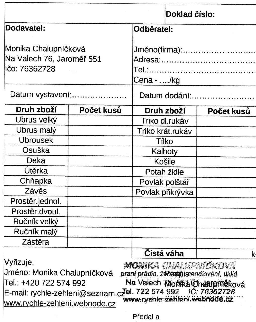 Je to jednoduché, buď si pro prádlo prijedete a odvezete si ho nebo to uděláme my za Vás ( v okolí 5km od Jaroměře je tato služba zdarma). V obou případech pro Vás bude připravena faktura, kterou Vám předám při předání prádla.